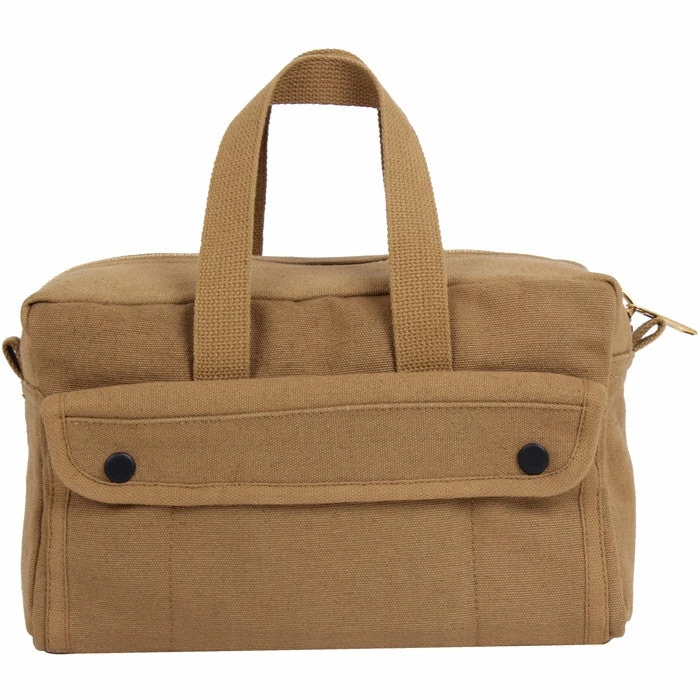 HW heavy weight cotton canvas. Heavy duty brass zipper. Durable heavy duty construction bag. Includes two outside button snap pockets. Outside pouch pockets is ideal for storing small components. Canvas carry strap for easy transport of bag. Main compartment has a zipper closure. Great bag for storing your tools. GI Government Issued style. Coyote Brown GI type brass zipper mechanics bag. Dimensions: 11″ x 7″ x 6″ (inches).