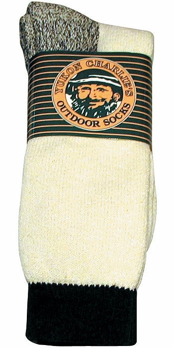 Cotton/Polyester blend. Black top, gray bottom and white body sock. Unisex. One size fits most. Comfortable fit. Fits great on any footwear. Keeps feet warm in cold weather. HW Heavy weight socks. Socks sold in pairs. Natural heavy weight thermal boot socks pair.