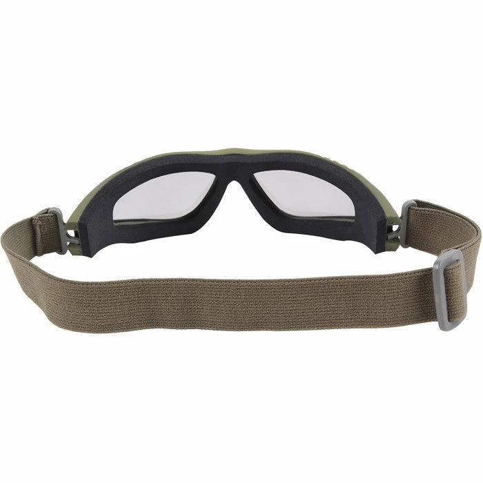 Olive Drab vented frame. With smoke lenses and UV400 protection. Lightweight. Padded frame. Smoke-grey shatterproof polycarbonate lens with anti-scratch coating, anti fog UV 400 protection. Contains adjustable elastic strap for secured fit. Elastic strap is 1″ (inch) thick.