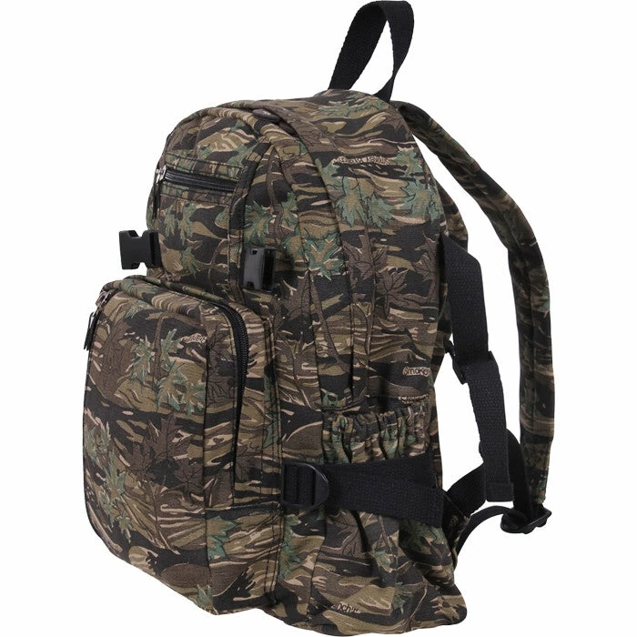 Smokey Branch Camouflage washed cotton canvas. Padded adjustable shoulder straps. Top carry handle for easy transport when back starts to hurt. 3 zippered compartments. 1 main zipper compartment. 2 elastic side pouches with above hold down straps. Canvas color – Smokey Branch. Backpacks are often preferred to handbags for carrying heavy loads, because of the limited capacity to carry heavy weights for long periods of time in the hands. Also know as a book bag or schoolbag. GI Government Issued type. Dimensions: 15 x 13.5 x 7.