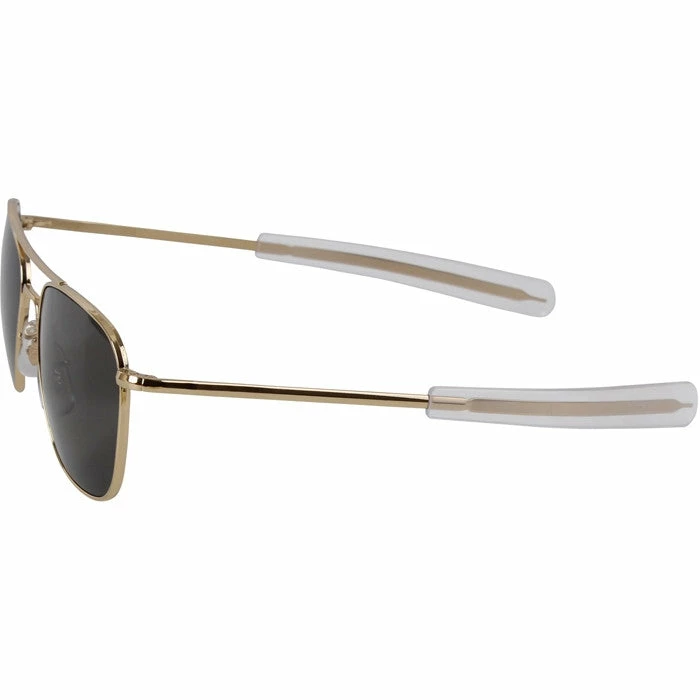 Official US Air Force pilots sunglasses. Scratch-resistant glass lenses. Protection: 100% UVB rays and 98% UVA. Made in USA by US government supplier American optics. Gold frame, grey true color glass lenses. Steel allot frames with bayonet temples. Includes storage case. Extremely stylish and comfortable. American optics: Gold – 52mm GI Air Force Pilots sunglasses – w/case.
