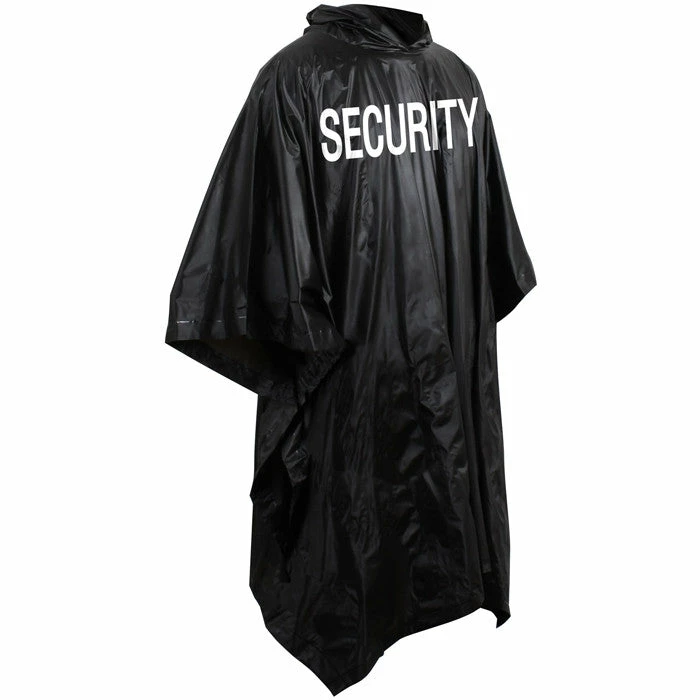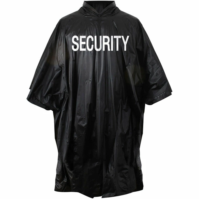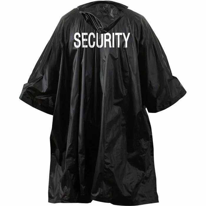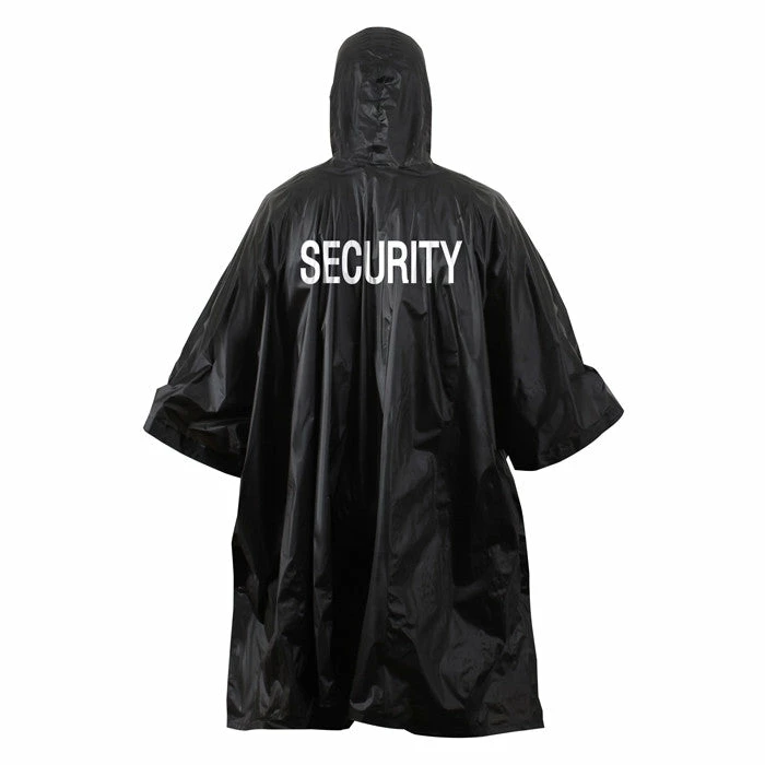 The tactical black Security Poncho is heat sealed and features a black vinyl with white security printed on both front and back.