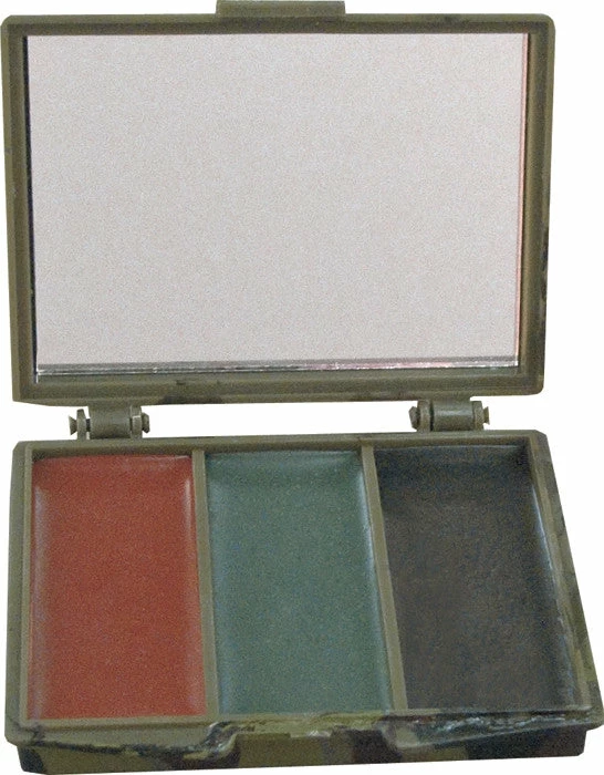 3 woodland camouflage colors. Colors: Black, olive drab, and brown. Mirror included. GI Government Issued Type. Pocket size. Easy to carry around. Painting is temporary, painted onto the human skin, and lasts for only several hours. From ancient times, face paint has been used for hunting, religious reasons, Halloween and military reasons (such as camouflage and to indicate membership in a military unit). Camouflage military compact face paint.
