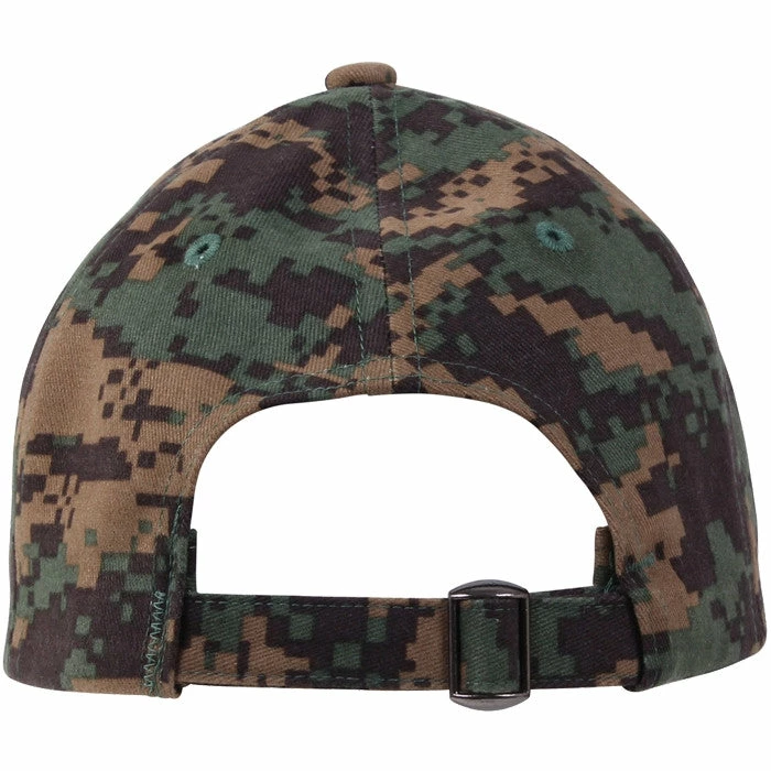 Brushed cotton twill. Padded sweatband. T-sliding adjustable metal buckle. Kids Cap. Adjustable cap. One size fits most. Very stylish and comfortable. Army style. Military style. Woodland Digital Camo Kids low profile cap.