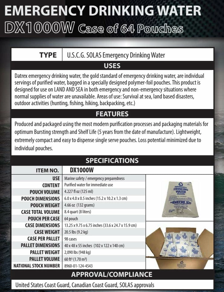 Datrex emergency drinking water, the gold standard of emergency drinking water, are individual servings of purified water, bagged in a specially designed polymer-foil pouches. This product is designed for use on LAND AND SEA in both emergency and non-emergency situations where normal supplies of water are unavailable. Areas of use: Survival at sea, land based disasters, outdoor activities (hunting, fishing, hiking, backpacking, etc.).