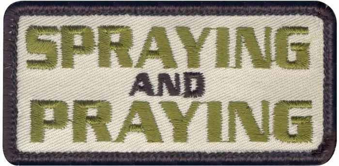 - Displays “Spraying and praying” on the front in embroidered letters
