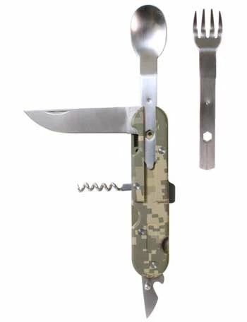 Includes fork, spoon, knife, cork screw and can opener. Spoon handle has flathead screw driver and hex wrench. Army digital camouflage carry pouch with MOLLE attachment strap. M.O.L.L.E compatible. Used by campers, military, civilians, traveling and more. GI government issued style. Army Camo. Chow set.