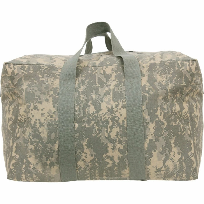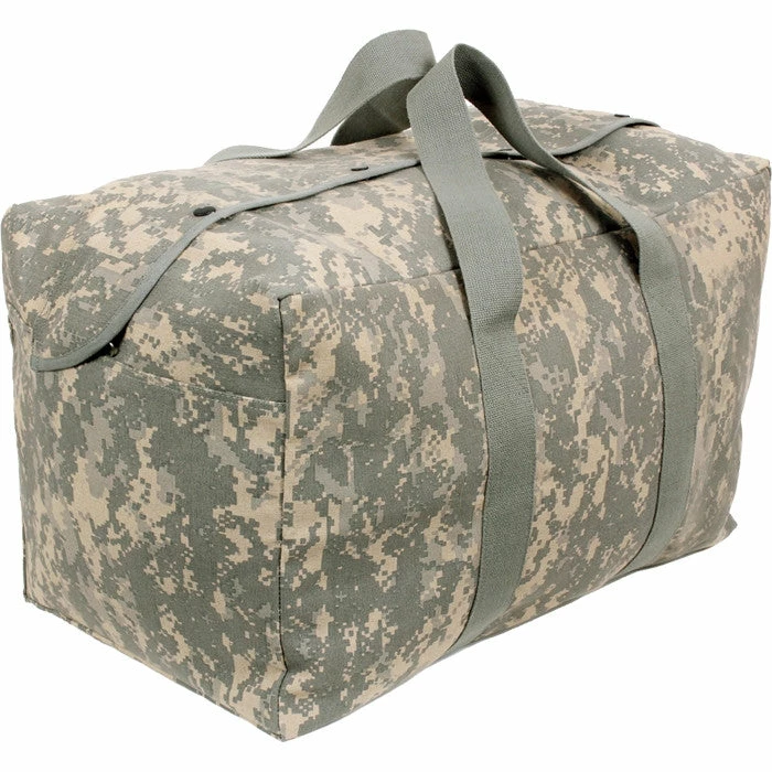 The parachute cargo bag is a perfect accessory for traveling. The military cargo travel bag can fit enough gear and clothing to be used on tactical operations or as an overnight bag. ACU Digital Camouflage military style parachute cargo travel pack.