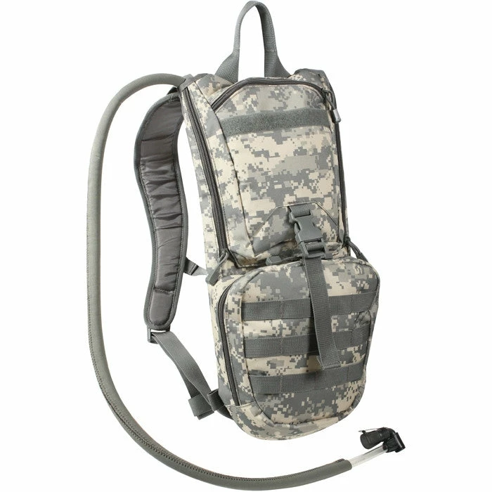 Made of heavy weight 600 denier polyester. Contains a 3 liter bladder. MOLLE compatible to accommodate additional MOLLE pouches and accessories. Neoprene covered plastic hose with bite valve. Bite valve with on/off switch. Quick release shoulder straps. Sternum strap. Top carry handle. Zipper closure bladder compartment. Front zipper closure storage compartment. 2 d-rings at bottom. Loop for name tape, branch tape or other patch attachments. This handsfree hydration system is great for outdoor activities, including running, jogging, hiking, bicycling, rock climbing and much more. Quench your thirst with this handsfree tactical hydration pack. ACU Digital camouflage rapid trek hydration pack.
