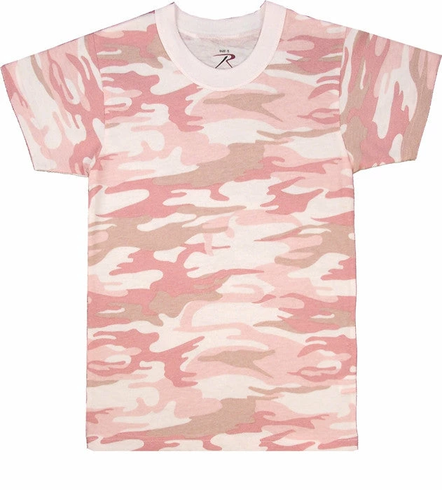 Cotton/Polyester blend. Tag less label. Short sleeves. Very cute and stylish. Comfortable. Unisex. Baby Pink Camouflage – Kids t-shirt.