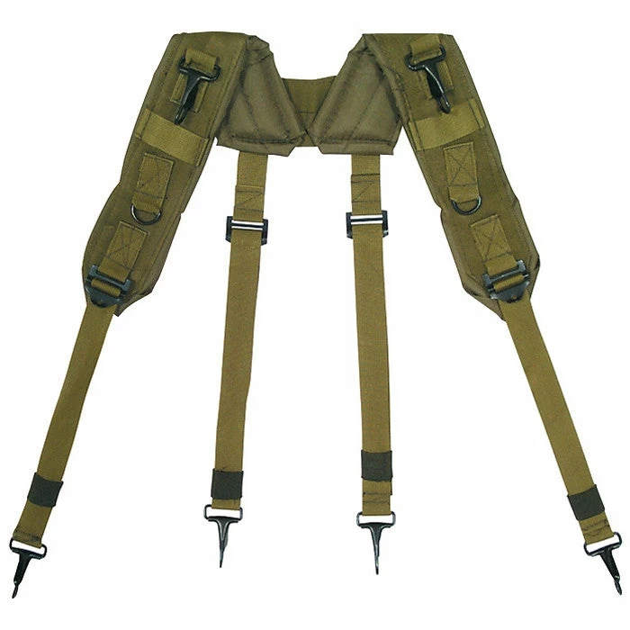Light weight regulation nylon web construction. Top quality craftsmanship. The combat H type suspenders compensate for weight distribution and load shifts. Padded shoulder straps for extra comfort on the shoulders. Regular size adjusts. Metal clips attached to equipment belt and butt pack or any field equipment. Really a very useful item when carrying a heavy equipment belt and or butt pack around the waist. Also referred to as a a rugged load bearing harness. Definitely relieves a lot of weight off your pants and hips. Helps prevent pants from sagging. Made to military specifications. GI Government Issued style. Army style. Olive Drab GI style H type nylon LC1 suspenders. LC 1.