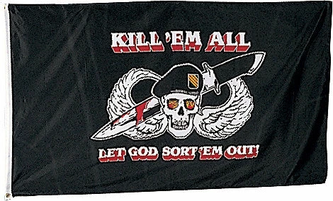 Great to use symbolically for signaling your beliefs or identification. KILL ‘EM ALL LET GOD SORT ‘EM OUT printed on front of flag. Black flag with skull with beret and parawing pictured. Knife going through skull with blood on knife pictured. This flag can be placed on a flag pole mounting bracket (Item# 189). Black skull and wing kill ’em all flag 3′ x 5′. Dimensions: 3′ x 5′ (feet).