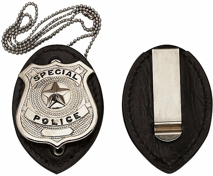 Tempered steel clip. Made In USA. This badge can be placed on our Dog tag chain (Item# 8384). Black clip on leather badge holder.