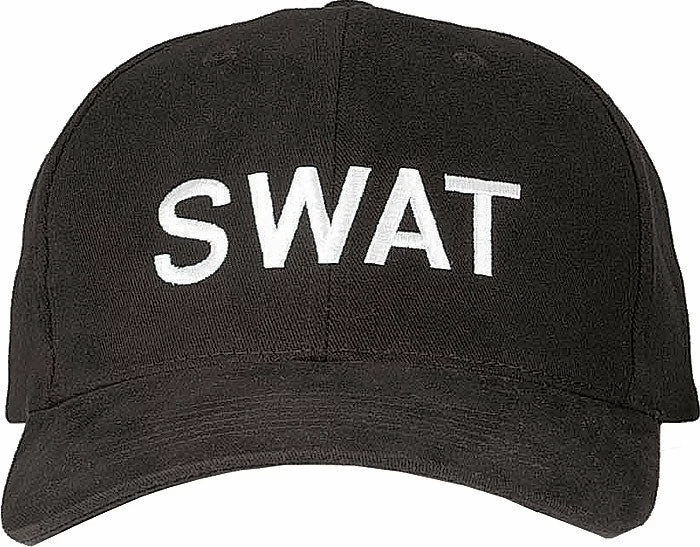 Comfortable brushed cotton twill. One size fits most. Padded sweatband. T-sliding adjustable metal buckle. Embroidered insignia. Black insignia cap with white lettering on the front. Black SWAT lettering supreme low profile cap.