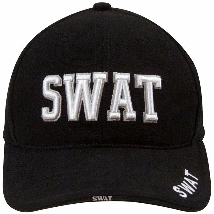 100% brushed cotton twill. Unisex. One size fits most. Cap color is black with white lettering. SWAT printed on sandwich brim. Velcro closure with 1 piece woven label. SWAT printed on hook and loop closure. SWAT printed on front panel. Upper brim with SWAT direct embroidery. Adjustable hook and loop closure. SWAT – Special Weapons And Tactics. Black – SWAT deluxe low profile cap.