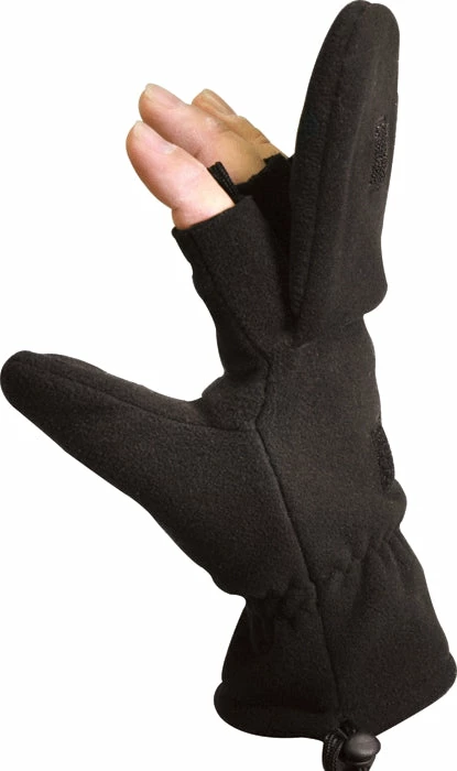 Polyester fleece. Glove/mitten. Made from breathable and windstopper polyester fleece. Fingerless glove with retractable mitten top. Mitten top secures to top of glove with hook and loop. Black, suede type palm and thumb patches elastic wrist with locking drawstring pull. Black colored gloves with a black colored palm. All purpose use: agriculture, factories, road work, mining, plumbing, construction, printing, stamping, municipalities, utilities. GI Government issued style.