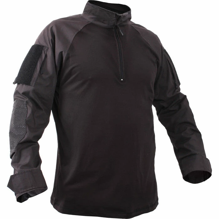 The 1/4 zip FR combat shirt is made for comfort, worn for protection, perfect for military personnel in the field to wear under hot, heavy body armor and tactical vests. This combat shirt is made of a no-melt, no-drip fabric, rated to withstand heat up to 230 degrees Fahrenheit. The combat shirt is lightweight and has breathable fabric that wicks away moisture while keeping you dry. FROG (Flame Resistant Organization Gear) style combat shirt. GI Government Issued style. Black lightweight and breathable 1/4th zipper FR army combat shirt.