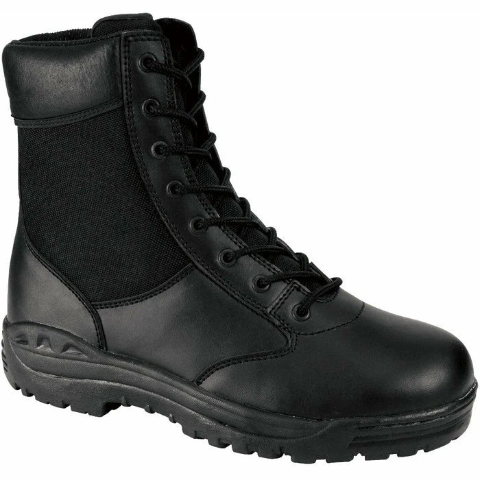 ISO 9001 certified. Leather and denier nylon upper. Pigskin leather collar. Steel shank. Slip-resistant cup sole. Rust-proof hardware. Moisture-wicking lining. With plastic tag on shoe laces.