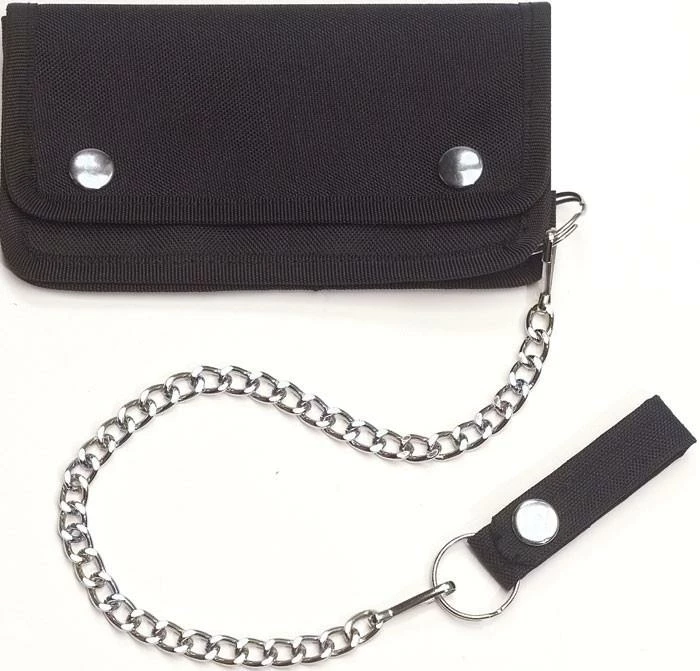 600d polyester. 14″ (inch) long chrome chain with snap belt loop. 2 front snaps. Motorcycle biker wallet. Black trucker wallet. Dimensions 6 3/4″ x 3 3/4″.
