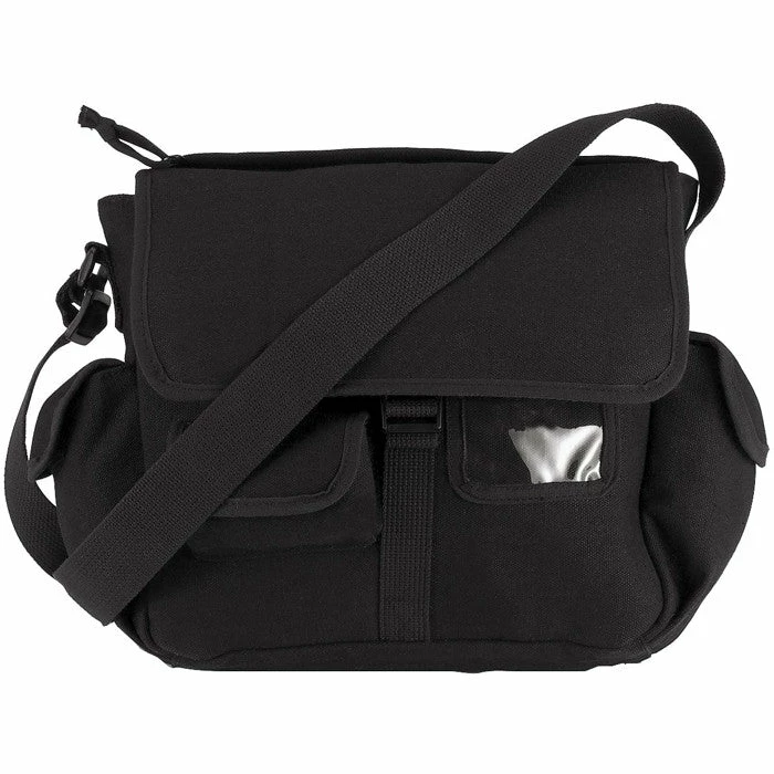 HW heavy weight 22 ounce cotton canvas. Large main compartment with hidden zipper pocket. Large outside pocket with hook & loop closure. Storm flap with zip pocket and quick release. 12 pockets total. ID holder. Adjustable shoulder strap. Comfortable and lightweight. Bag has a similar look to our other shoulder and messenger bags but contains far more pockets to separate storage of items. Plain no emblem. Army inspired bag. Ensures comfort to people carrying heavy and/or bulky items, while allowing easy access to the contents. Sometime referred to by cyclists as a shoulder bag and or courier bag. These bags are unisex and worn by both genders. Black urban explorer canvas shoulder bag. Dimensions: 12″ x 10″ x 4″ (inches).