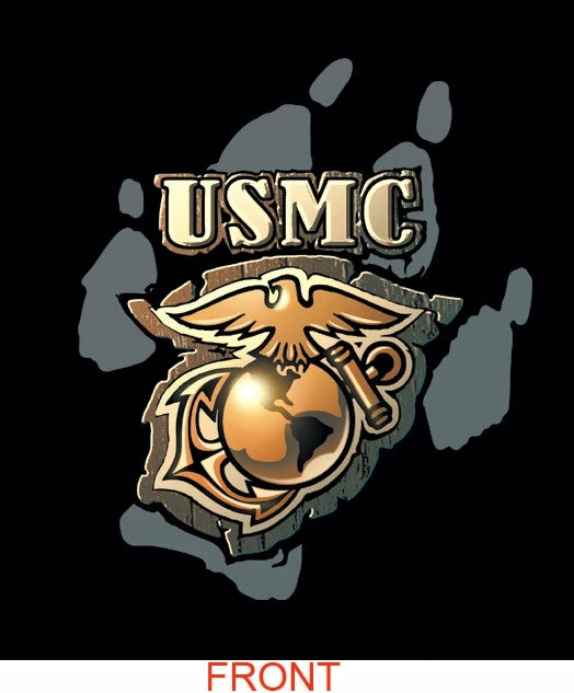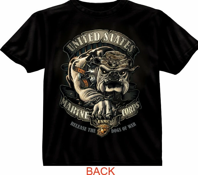 100% preshrunk cotton material. 2-sided print. USMC print on front and globe and anchor emblem. United States Marine Corps, devil dog. Release the dogs of war print on back. Devil Dog pictured. Black color.