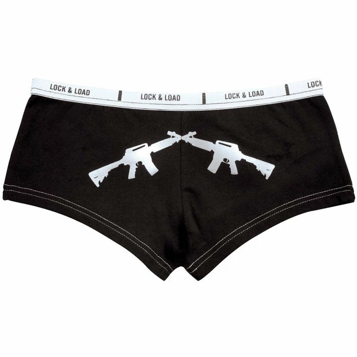 Cotton/Spandex blend. Underwear / lounging item. Black booty shorts with white elastic waistband. Lock and load printed on the waist band. Pictured on rear and front left side: 2 rifles crossing. Very sexy and comfortable. Army style. Military style.