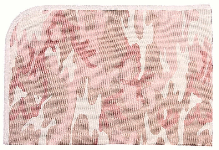 Soft non-irritable 100% cotton material. Thermal type material. Solid Pink outer layer surrounding blanket. Baby Pink Camouflage infant receiving blanket. Dimensions: 28″ x 40″.