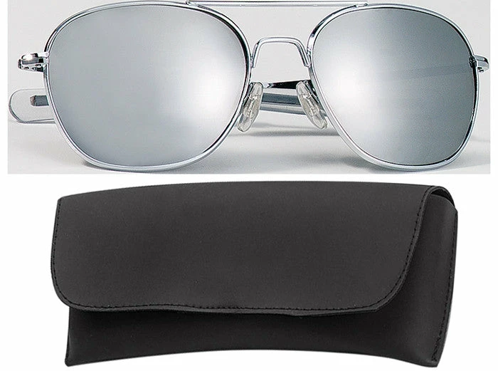 US Air Force Style aviators. GI Government Issued style. 52mm lenses. Bayonet temples. Chrome frame. Mirror lenses. Lens comprised of hard coating glass. Frame is composed of nickel silver. Finish: tempering, grounded, gold plating clear plastic tip. Includes black case. Extremely stylish and comfortable. Unisex. Chrome Frame/mirror lenses – 52mm pilot aviator sunglasses – w/case. Protects from UV rays. Specification: UV400.