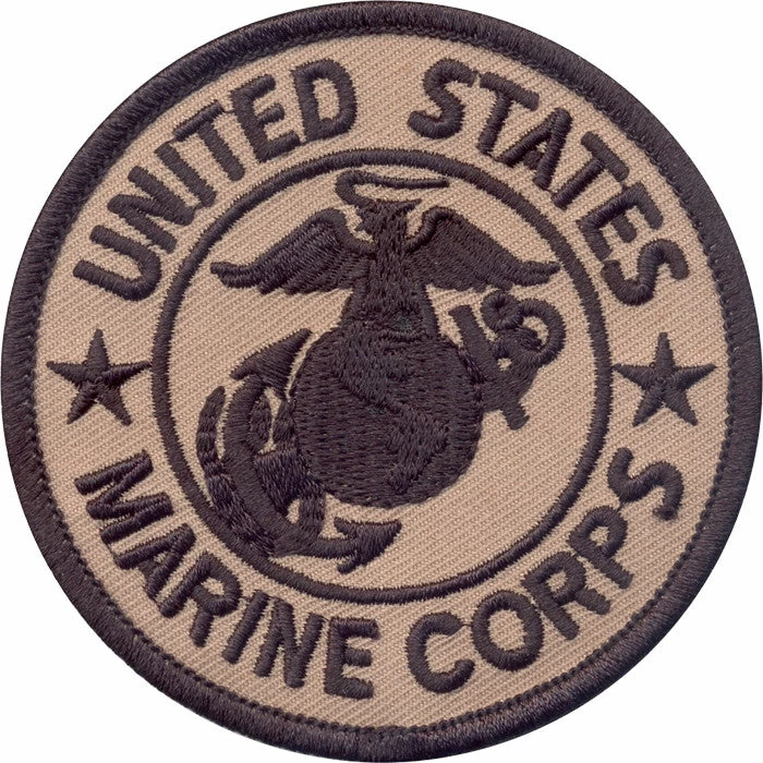 Iron on/sew on military embroidered patch. Round Design UNITED STATES * MARINE CORPS * printed on front. Marines globe and anchor emblem pictured on front. 3″ (inches). USMC – United States Marine Corps. Coyote Brown USMC logo patch.