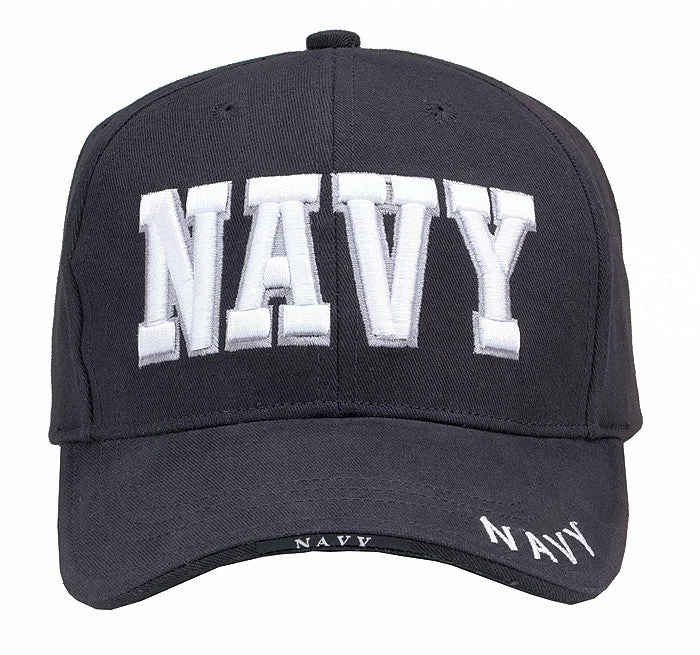 100% brushed cotton twill. Unisex. One size fits most. Raised embroidery lettering white. Sandwich brim with 1 piece woven label. Hook and loop tape closure with 1 piece woven label. Front panel with navy raised embroidery. Upper brim with navy direct emroidery. Seam tape with one color direct print. Navy Blue – US Navy logo deluxe low profile cap.