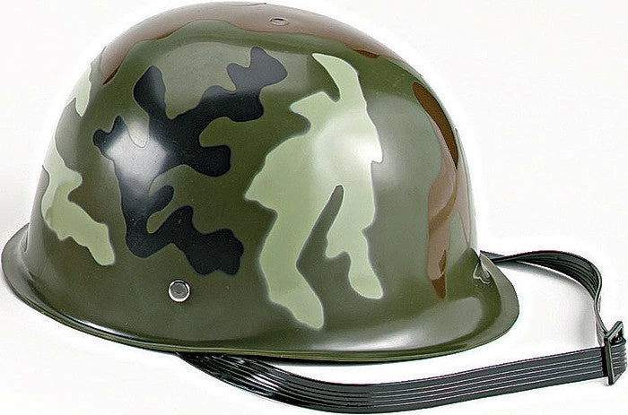 Plastic material. Comes with a chin strap to secure helmet on head. Great for recreational use, school plays, dressing up, and much much more. Army style. Military style. Woodland Camouflage – kids Army helmet.