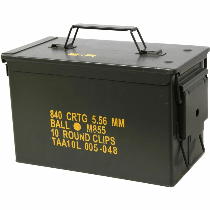 The M2A1 ammunition box has been used by the U.S. military for small and medium caliber cartridges, for artillery fuses and more: Some examples are Cartridge 5.56 mm bandoleers and linked, Cartridge 7.62 mm bandoleers and linked, Cartridge .30 caliber carbine, Cartridge .50 caliber linked, Cartridge .38 special, Cartridge 9mm (20 cartons of 50), Cartridge .45 ACP, Cartridge 12 gauge shotgun shell, Cartridge .22LR.