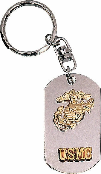 Stylish dog tag key chain. USMC printed on front of dog tag in gold lettering. Globe and anchor logo pictured on front in gold coloring. Silver key ring attached to god tag. Silver USMC crest dog tag key chain.