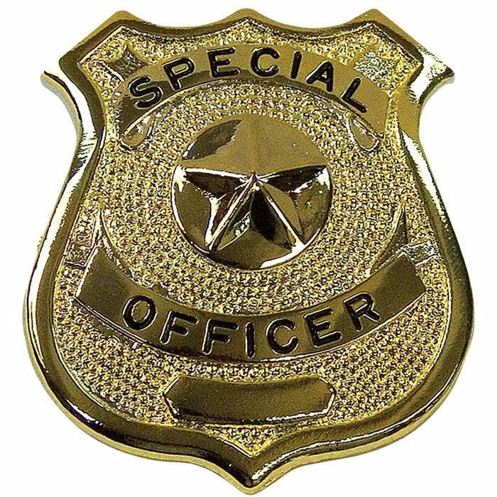Pin back closure. SPECIAL OFFICER printed on badge in black lettering. Star pictured in middle of badge. Gold colored badge. Gold Special Officer badge. Dimensions: 3″ x 2″.