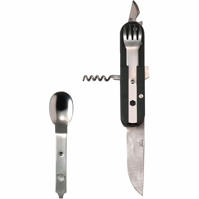 Fork, spoon, knife, corkscrew and can opener in olive drab pouch. GI Government Issued Style. Used by campers, military, civilians, traveling and more. Foreign legion 5 in 1 chow set.