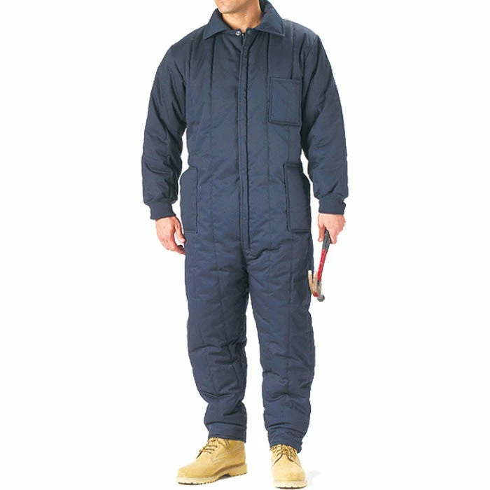 Tough polyester/cotton twill shell. Nylon lining. 6 ounces polyester fiberfill. 2 front slash pockets. 1 left chest pocket. Knit cuffs. Self collar. 2-way front zipper. Leg zippers. Mens insulated coveralls. Navy Blue color.