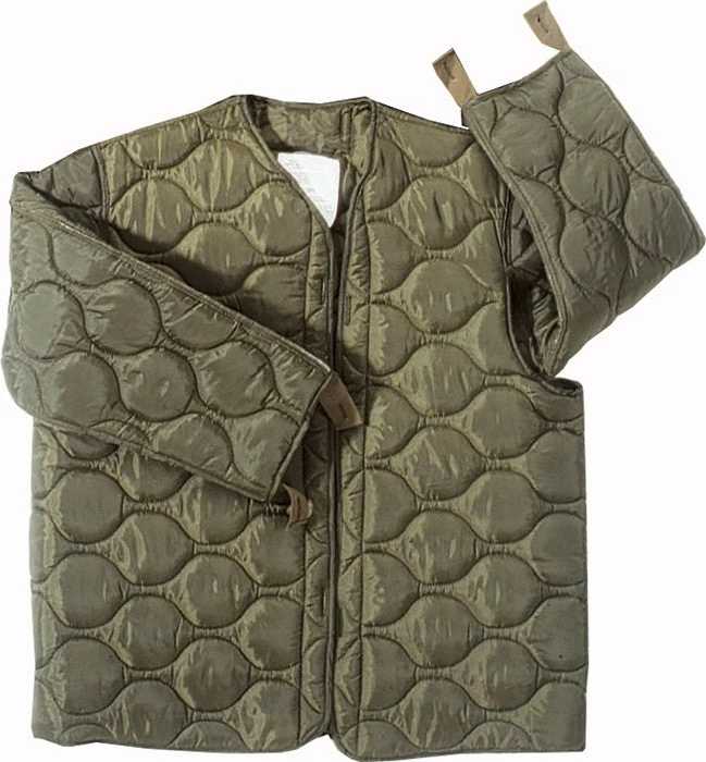 Made for M-65 field jackets. Quilted nylon outer shell with 5 ounce polyester fill. Provides comfort as well as warmth. Buttons into all US type field jackets. GI Government Issue style. OD Green m65 field coat liner. M 65 liner.
