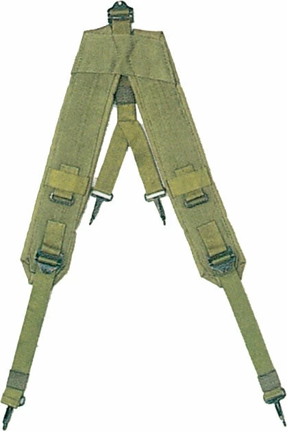 Light weight regulation nylon web construction. Top quality craftsmanship. Padded shoulder straps for extra comfort on the shoulders. Regular size adjusts. Metal clips attached to equipment belt and butt pack or any field equipment. Really a very useful item when carrying a heavy equipment belt and or butt pack around the waist. Also referred to as a a rugged load bearing harness. Definitely relieves a lot of weight off your pants and hips. Helps prevent pants from sagging. Made to military specifications. GI Government Issued style. Army style. Olive Drab GI style nylon Y LC1 suspenders. LC 1.