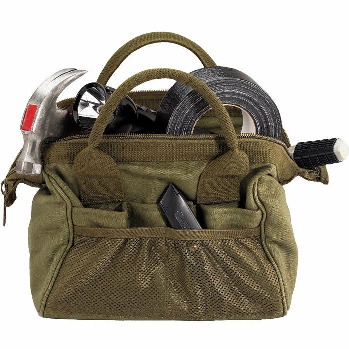 HW heavy weight 22 ounce cotton canvas. Framed super wide mouth stays open for lots of gear. 8 interior and 10 exterior pouches. Hard bottom. Carry handles for easy and simple transport. Main compartment has a nylon zipper closure. Netted pocket on front of bag. Made to fit most medical contents needed by medics. Also a great item to store tools and around the house supplies. Black platoon kit medics tool bag. Purchase is for bag only. Olive Drab platoon kit medics tool bag. Dimensions: 12″ x 10″ x 11″ (inches).
