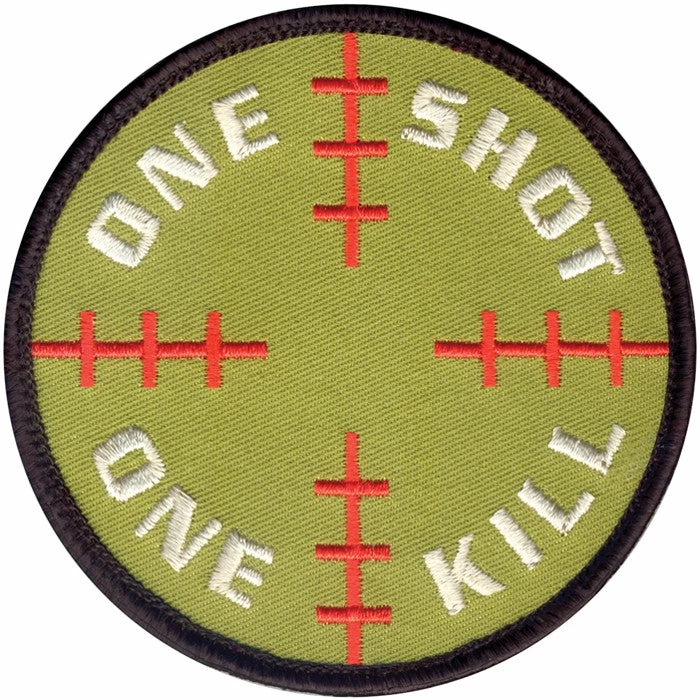 1 shot 1 kill sniper patch with hook backing. Hook backing to easily attach to a loop patch. 3.25″ round. One shot one kill printed in cross hair.