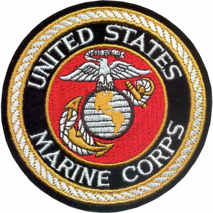 Deluxe round patch. Iron on/sew on military embroidered patch. Round Design UNITED STATES MARINE CORPS printed on front in white lettering with black background and gold lining. Marines globe and anchor emblem pictured on front. 4″ (inches). USMC – United States Marine Corps. Deluxe round USMC 4 inch patch.