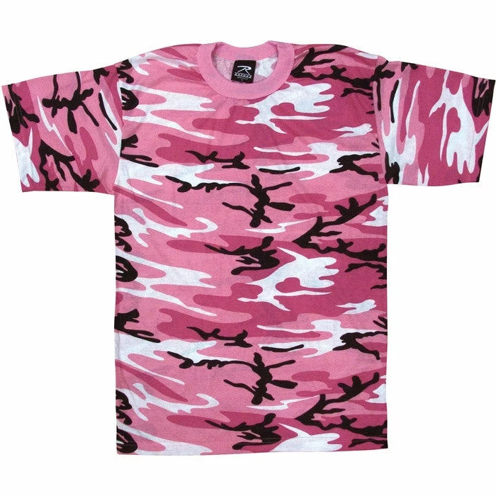 Polyester/Cotton material. Very stylish and comfortable. Short sleeve. Unisex. Solid Pink neck collar. Army style. Military style. Pink Camouflage kids t-shirt.