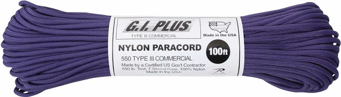 Paracords have an unlimited amount of purposes including purposes inside the house, outside in the yard, in the wilderness, first aid, arts and craft and much more. These paracords are often used for tent and pole support and building shelters. Often, campers use these ropes and a near by tree branch to act as a pulley to elevate food off the ground so it can’t be reached by animals. Used as clothes line by many individuals and campers. The paracord can act as a spare set of shoes laces when needed or even as blousing garters. The inner stands are essential to first aid and survival in the wilderness. The strands of the cords can be removed and used as a fishing line, stitching to close a deep wound, dental floss, trapping and snares, sewing and much more. It is highly recommend to boil the strands before stitching a deep cut. Paracord bracelets are a very popular accessory worn by many children and adults for fashion and also as a survival tool, if needed to be used. You can make you own personalized paracord bracelet with the paracord we carry, it generally takes 9 – 11 feet of cord to make an 8 inch paracord bracelet. There is no reason you should be stranded without this essential surviving tool, it can mean the difference between life and death. Purple genuine GI 550lb nylon 100 feet cord. Size: 100′ feet. Made In USA. This product is GSA Compliant.