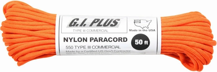 Paracords have an unlimited amount of purposes including purposes inside the house, outside in the yard, in the wilderness, first aid, arts and craft and much more. These paracords are often used for tent and pole support and building shelters. Often, campers use these ropes and a near by tree branch to act as a pulley to elevate food off the ground so it can’t be reached by animals. Used as clothes line by many individuals and campers. The paracord can act as a spare set of shoes laces when needed or even as blousing garters. The inner stands are essential to first aid and survival in the wilderness. The strands of the cords can be removed and used as a fishing line, stitching to close a deep wound, dental floss, trapping and snares, sewing and much more. It is highly recommend to boil the strands before stitching a deep cut. Paracord bracelets are a very popular accessory worn by many children and adults for fashion and also as a survival tool, if needed to be used. You can make you own personalized paracord bracelet with the paracord we carry, it generally takes 9 – 11 feet of cord to make an 8 inch paracord bracelet. There is no reason you should be stranded without this essential surviving tool, it can mean the difference between life and death. Neon orange genuine GI 550lb nylon 100 feet cord. Size: 100′ feet. Made In USA. This product is GSA Compliant.