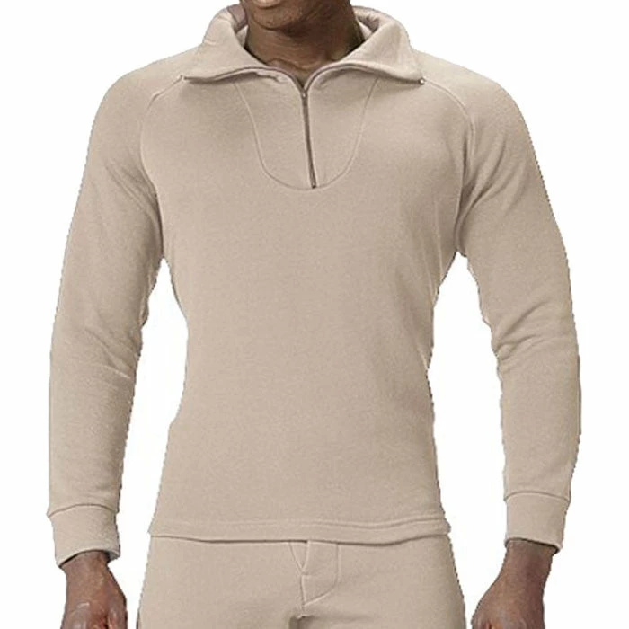 100% Polyester. Underwear. Shirt. GI type. Soft fleece lining. Zip collared. Elastic wrist cuffs. For extremely cold weather. Ultimate comfort. Sand Tan GI plus zip top.