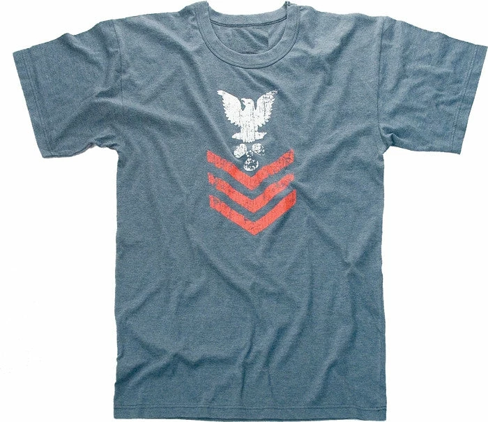 Washed cotton/polyester blend. Washed vintage look and feel. Super soft, Distressed rank insignia image on front of shirt. Excellent for screen printing. With neck imprint for label for improved comfort. Blue Military Naval rank insignia vintage t-shirt.