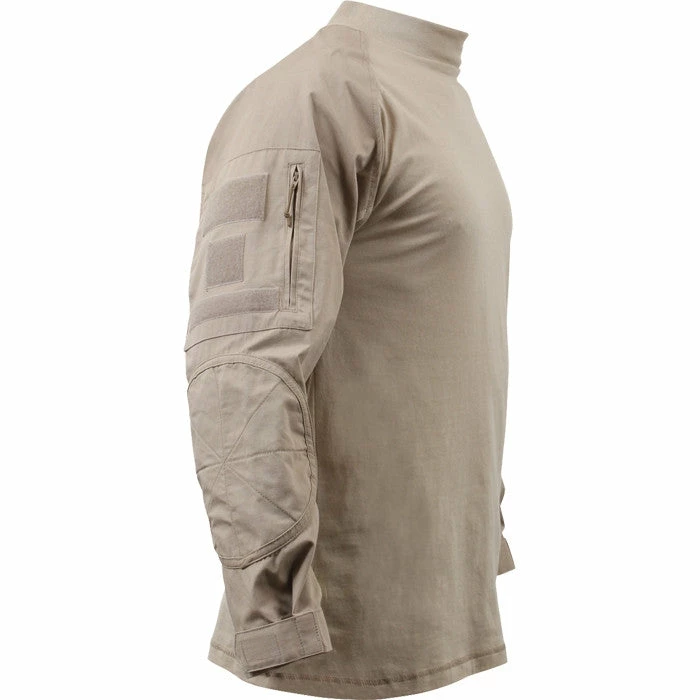 Khaki combat shirt is made for comfort, worn for protection, perfect for military personnel in the field to wear under hot, heavy body armor and tactical vests. This combat shirt is made of a no-melt, no-drip fabric, rated to withstand heat up to 230 degrees Fahrenheit. The combat shirt is lightweight and has breathable fabric that wicks away moisture while keeping you dry. FROG (Flame Resistant Organization Gear) style combat shirt. GI Government Issued style. Khaki lightweight and breathable army combat shirt.