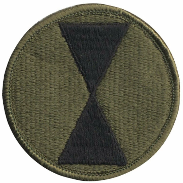 Iron on/sew on military embroidered patch. Seventh infantry division emblem pictured on the front of the patch in black coloring on a subdued background. Replica military patch. The 7th Infantry Division was an infantry division of the United States Army. The division was based at Fort Ord, California for most of its history. The final duty for the 7th Infantry Division before its inactivation in 2006 was as a training and evaluation unit for Army National Guard brigades. Due to its extensive combat history, the division is highly decorated, and has been featured numerous times in American popular culture. Nickname: Hourglass, Bayonet. Motto: Light, Silent, And Deadly. US Army patch. Seventh infantry division. Size: 2.5″ round.