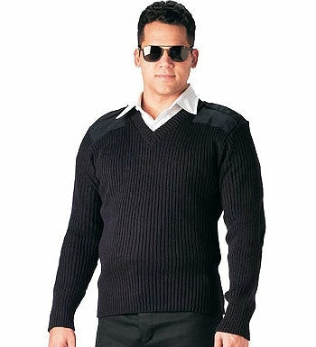 Acrylic material. Reinforced shoulder and elbow patches. Epaulets on shoulders. GI Government Issued type. Black GI Government Issued style Acrylic v-neck sweater.