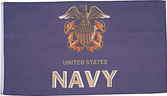 3-D emblem. Great to use symbolically for signaling your beliefs or identification. UNITED STATES NAVY printed on flag in khaki lettering. US Navy emblem aka US Navy eagle pictured on front. This flag can be placed on a flag pole mounting bracket (Item# 189). US Navy Anchor. 3′ x 5′ flag. Dimensions: 3′ x 5′ (feet).